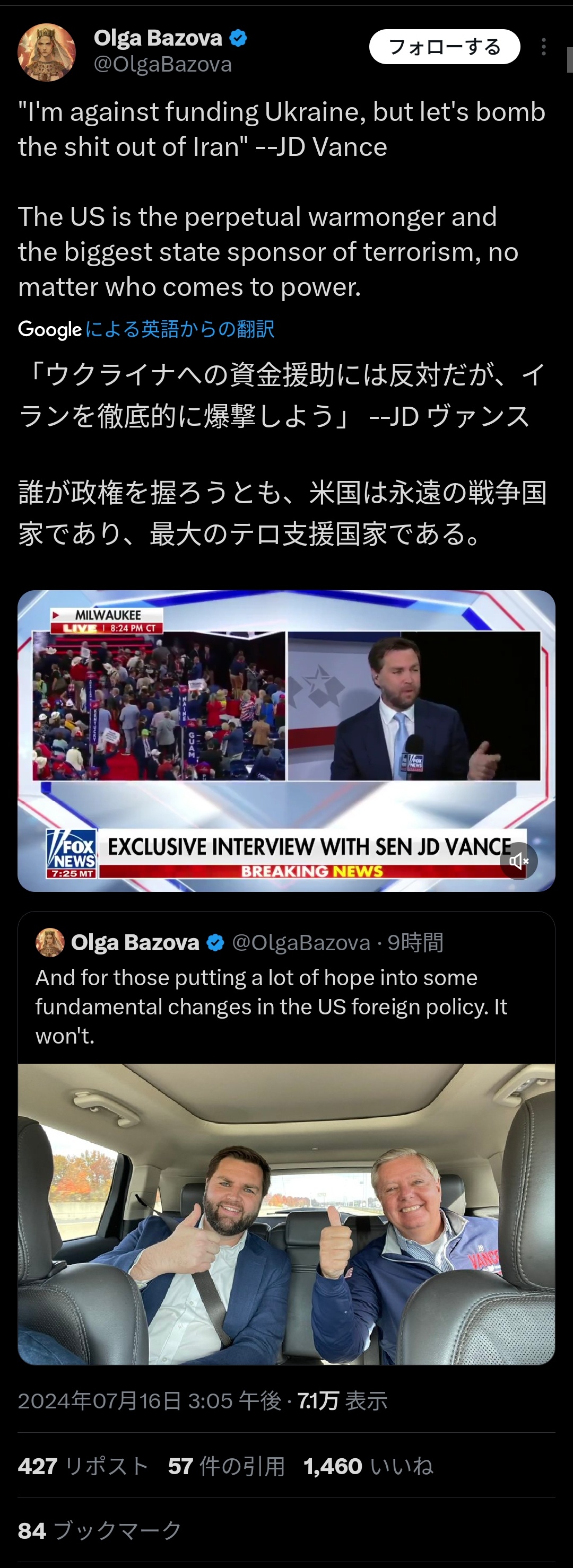 共和党、次期副大統領「ウクライナへの資金援助を打ち切る。代わりにイランを徹底空爆すべき」