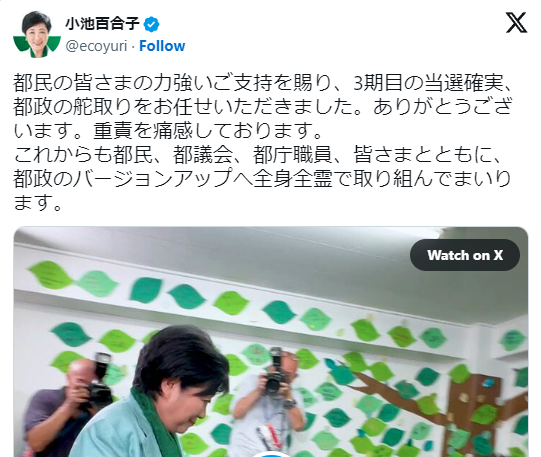 「小池知事のXが、都知事選挙の投開票がおこなわれた7月7日に《都民の皆さまの力強いご支持を賜り、3期目の当選確実、都政の舵取りをお任せいただきました。ありがとうございます》とポストしてから1週間以上、ストップしたままなんです。