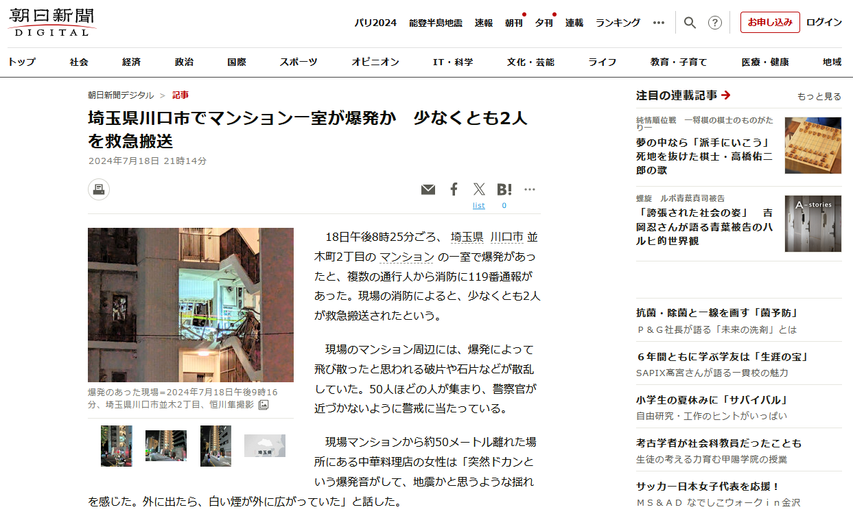 18日午後8時25分ごろ、埼玉県川口市並木町2丁目のマンションの一室で爆発があったと、複数の通行人から消防に119番通報があった。消防によると、けが人の有無は不明。消防車両11台を出動させて活動しているという。