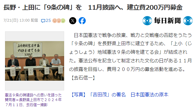 長野・上田に「9条の碑」を 11月披露へ、建立費200万円募金(毎日新聞)