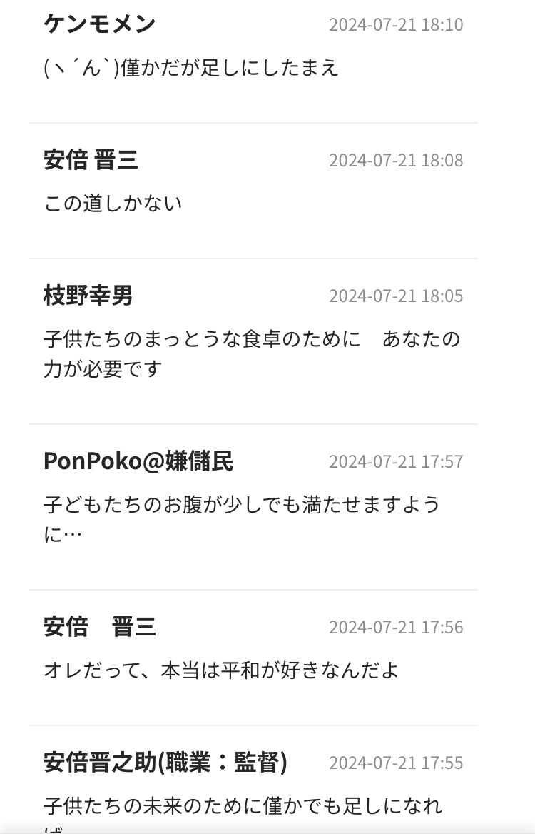 コメント欄が安倍晋三名義のコメントで溢れ返る(なおコメントを残すには最低でも3000円以上寄付をしないといけない)