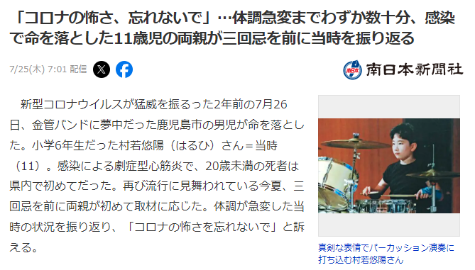 新型コロナウイルスが猛威を振るった2年前の7月26日、金管バンドに夢中だった鹿児島市の男児が命を落とした。小学6年生だった村若悠陽(はるひ)さん=当時(11)。感染による劇症型心筋炎で、20歳未満の死者は県内で初めてだった。再び流行に見舞われている今夏、三回忌を前に両親が初めて取材に応じた。体調が急変した当時の状況を振り返り、「コロナの怖さを忘れないで」と訴える。