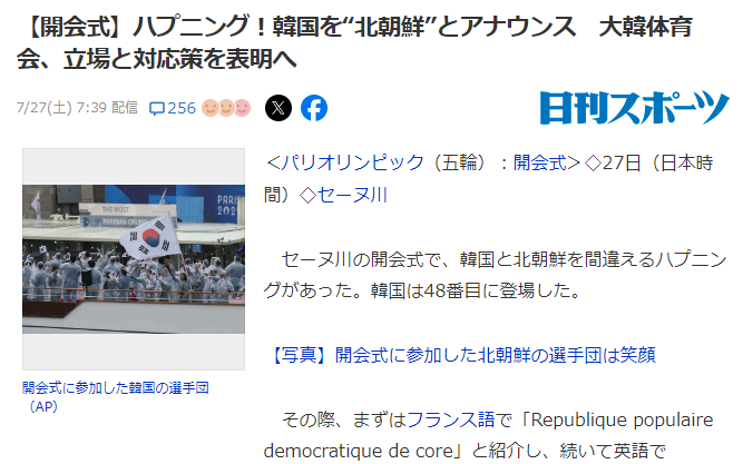 【パリ五輪】フランス「北朝鮮の入場です!(嘘だよ、韓国だよ)」 韓国「…」韓国政府「立場と対応策を表する」