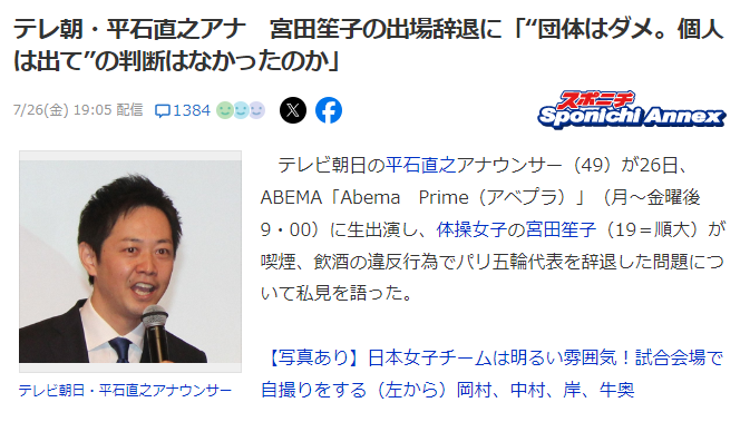 テレビ朝日の平石直之アナウンサー(49)が26日、ABEMA「Abema Prime(アベプラ)」(月~金曜後9・00)に生出演し体操女子の宮田笙子(19=順大)が喫煙、飲酒の違反行為でパリ五輪代表を辞退した問題について私見を語った。