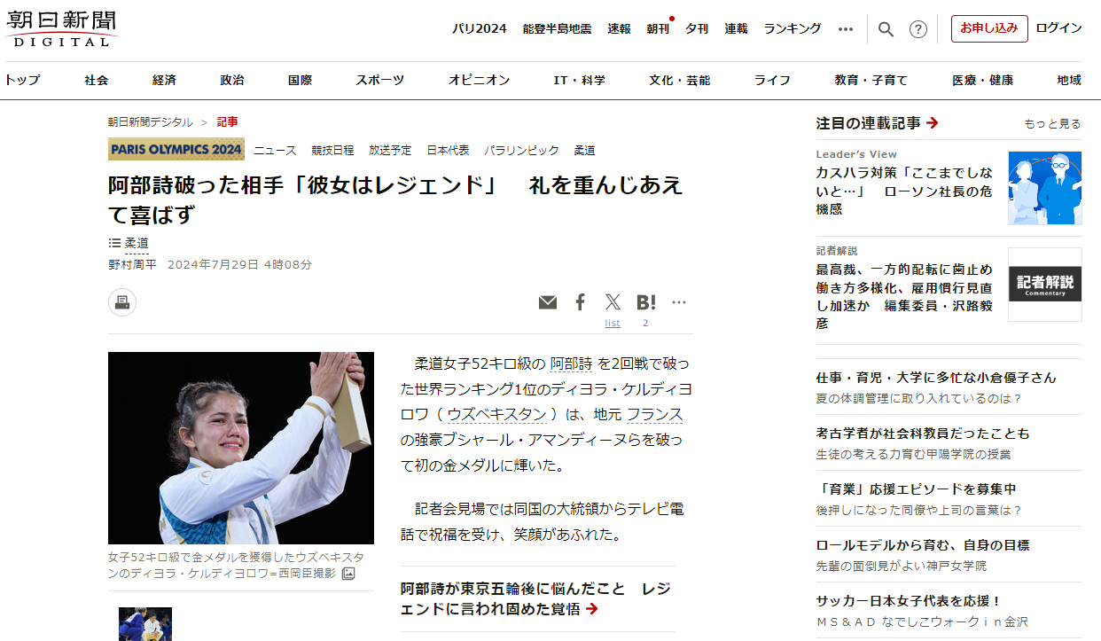 【パリ五輪/柔道】阿部詩破った選手が金、会見で「彼女はレジェンドで、完璧なチャンピオン。彼女をとても尊敬しているから、喜びたくなかったのです」