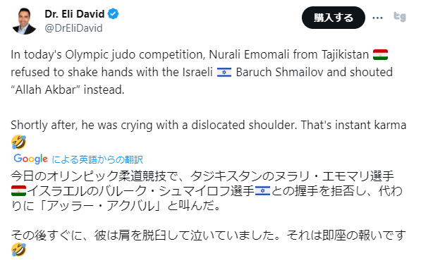 1: 名無し 2024/07/28(日) 20:24:51.27 ID:mIrGxTfIdIn today’s Olympic judo competition, Nurali Emomali from Tajikistan 🇹🇯 refused to shake hands with the Israeli 🇮🇱 Baruch Shmailov and shouted “Allah Akbar” instead.