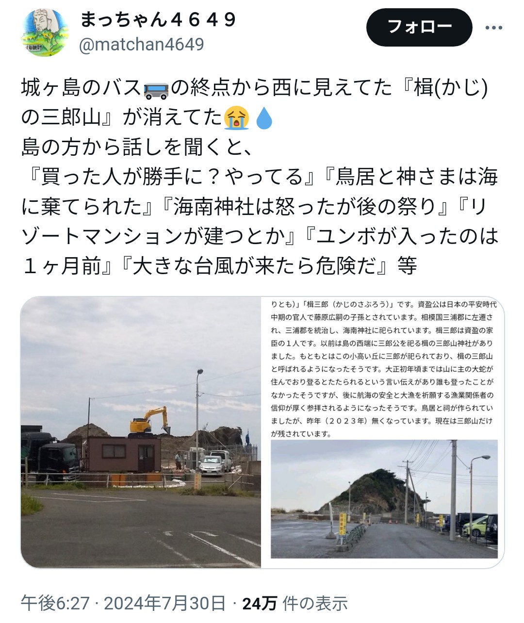 【画像】城ヶ島「楫の三郎山神社」 土地を買った業者に山ごと更地にされる 行方不明の鳥居と祠は海に投棄か