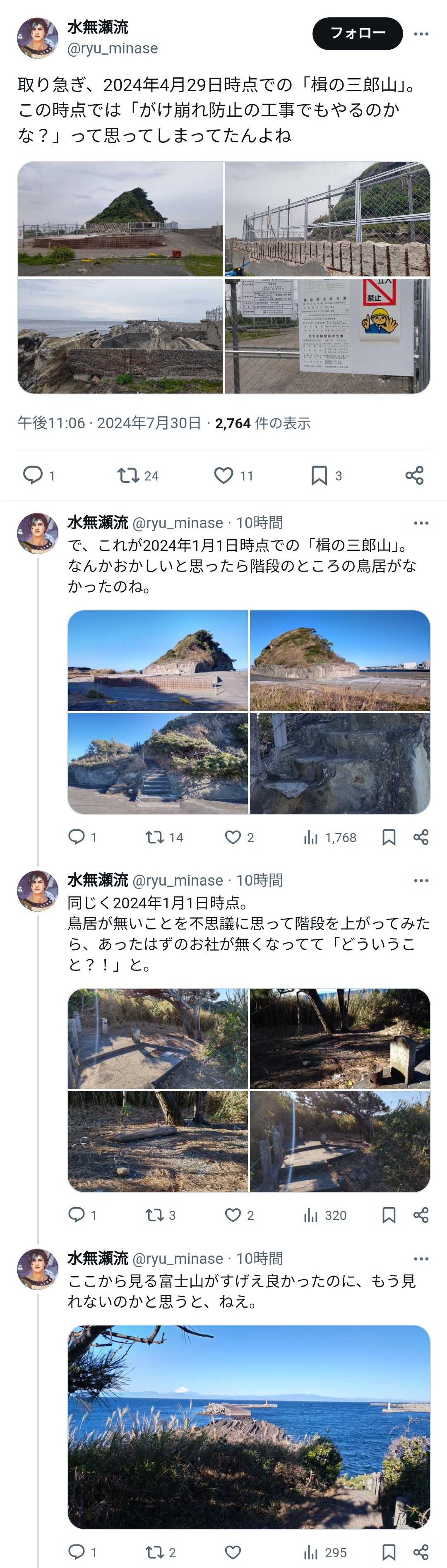 島の方から話しを聞くと、『買った人が勝手に?やってる』『鳥居と神さまは海に棄てられた』『海南神社は怒ったが後の祭り』『リゾートマンションが建つとか』『ユンボが入ったのは1ヶ月前』『大きな台風が来たら危険だ』等