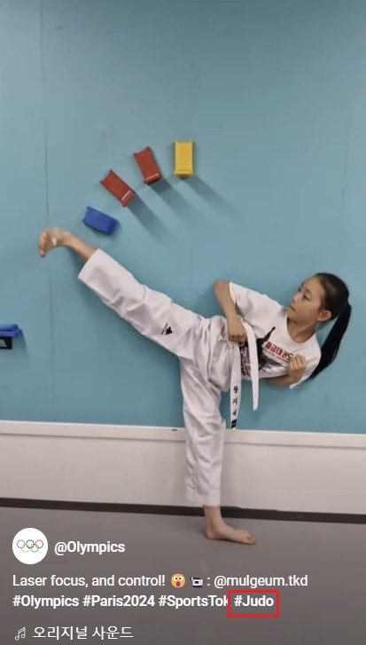 「テコンドー」と書かれたTシャツを着て蹴りの練習をする少女の姿が映っている映像で、「テコンドー(Taekwondo)」ではなく「柔道(Judo)」という誤ったハッシュタグが付けられた。