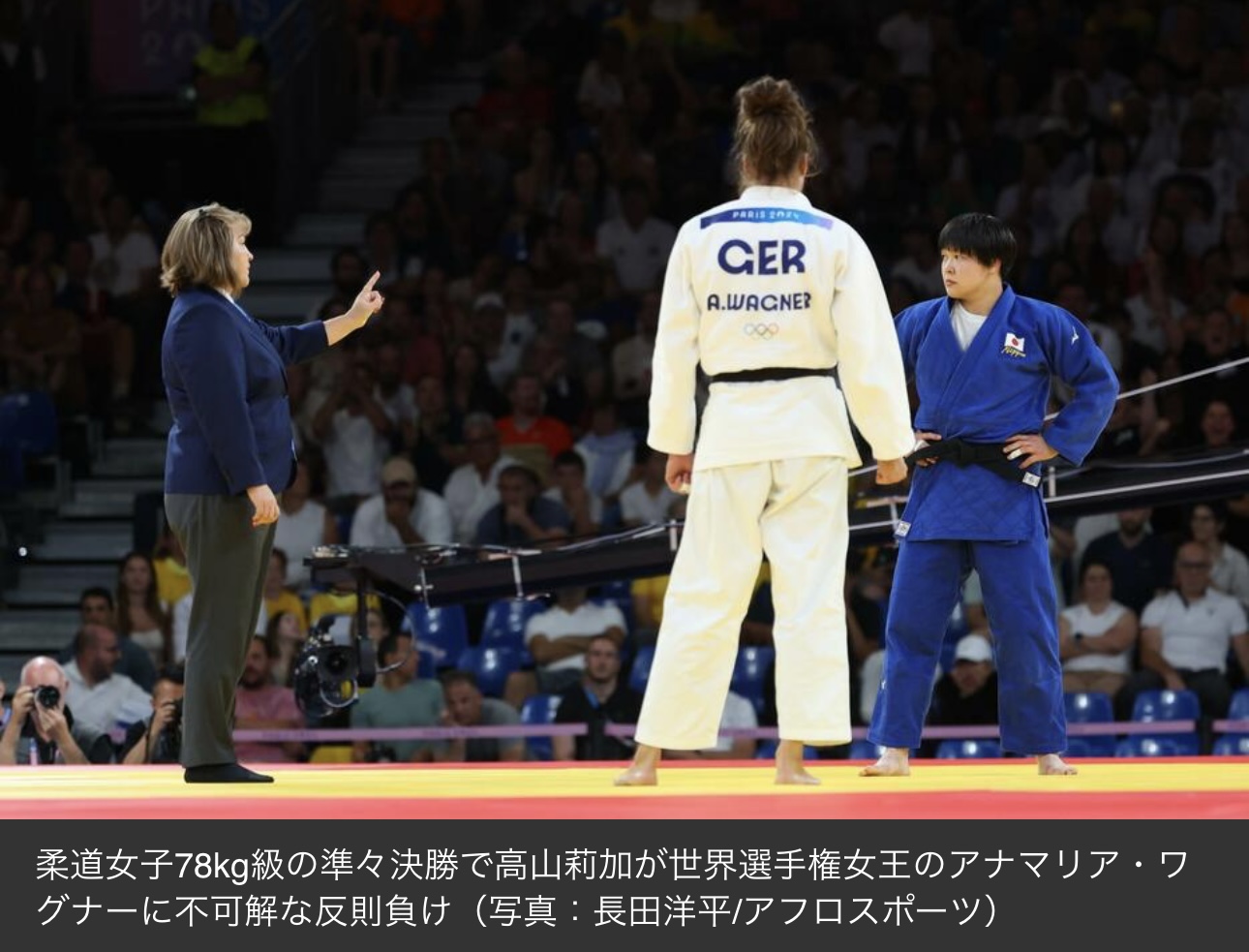 パリ五輪の柔道競技で、またしても日本が不可解な判定に泣かされた。1日にシャンドマルス・アリーナで行われた女子78kg級の準々決勝で、高山莉加(29、三井住友海上)が3分26秒にビデオ判定の末に3つ目の指導を受けて、世界選手権女王のアナマリア・ワグナー(28、ドイツ)に反則負けを喫した。