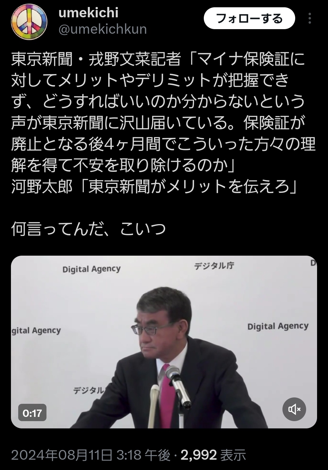 東京新聞「河野大臣!マイナ保険証のメリットを教えて下さい」河野大臣「それを考えるのは君だ」