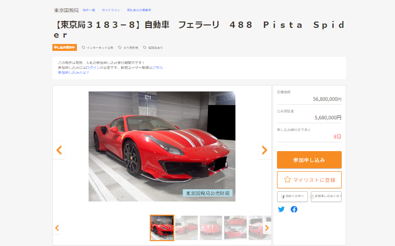 【過去最高】国税ネット公売にフェラーリが出現、最低入札5680万円「税金滞納で差し押さえ強制売却」