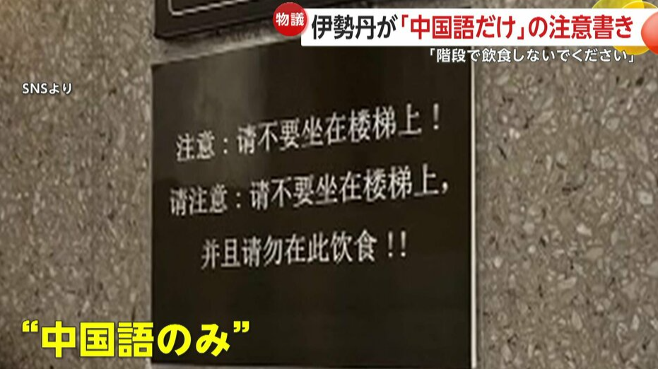 【中国語のみ】伊勢丹新宿店内の注意書き「階段に座らないで」「ここで食事しないで」中国人観光客「明らかな差別」三越伊勢丹本社「社内ルール違反、撤去しました」