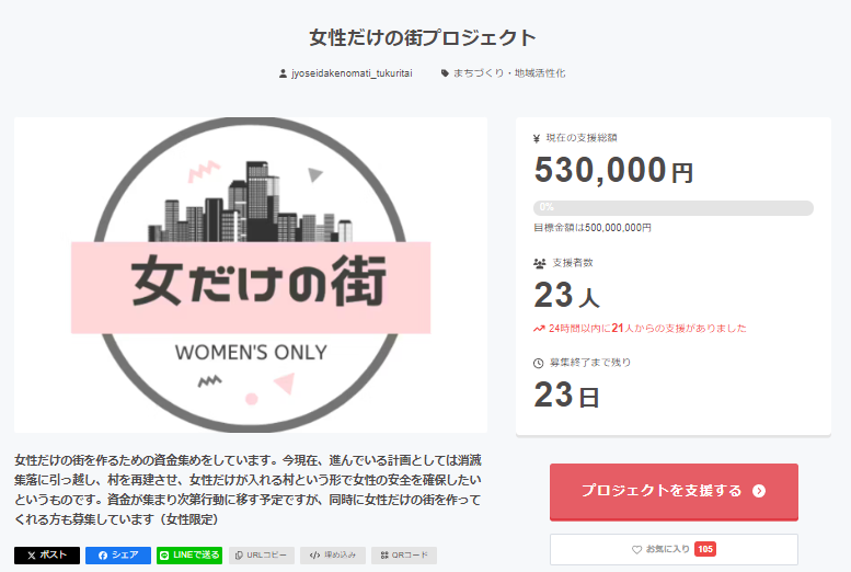 【朗報】「女性だけの街」プロジェクトが立ち上がる!クラファン目標額5億円!返礼は「お礼メール」