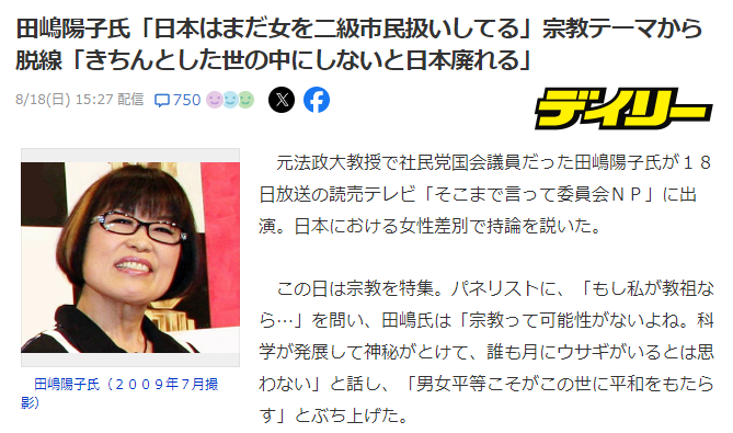 田嶋陽子氏「日本はまだ女を二級市民扱いしてる」宗教テーマから脱線「きちんとした世の中にしないと日本廃れる」