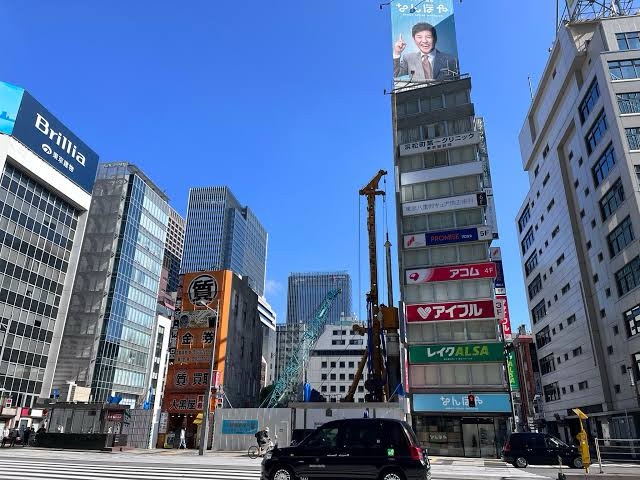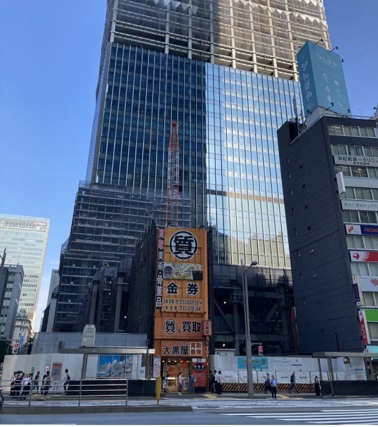 地権者(金券屋や金融系)が立ち退かなかったためオシャレな再開発ビルのエントランスの両隣が雑居ビルに