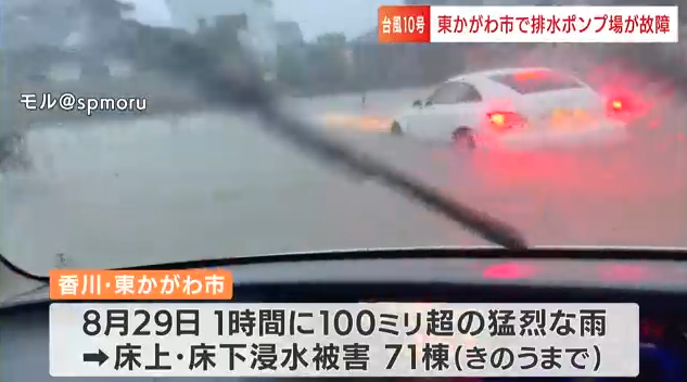 【香川】台風10号のせいで浸水被害!→排水ポンプ場の故障が原因と判明、早朝点検したのに偶然にも2機同時故障したらしい