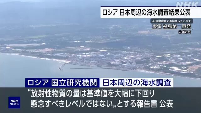 ロシアの国立研究機関は、東京電力福島第一原発にたまる処理水の海への放出を受けて日本周辺の海水を調査した結果、海水に含まれる放射性物質の量は基準値を大幅に下回っていたとする報告書を公表しました。