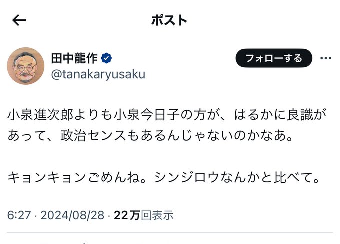 【速報】小泉進次郎への「知的レベル質問」各所で炎上 なお記者の田中は過去に「(小泉に掛けて)小泉今日子の方がセンスある」と謎のだだスベリほ掘られる