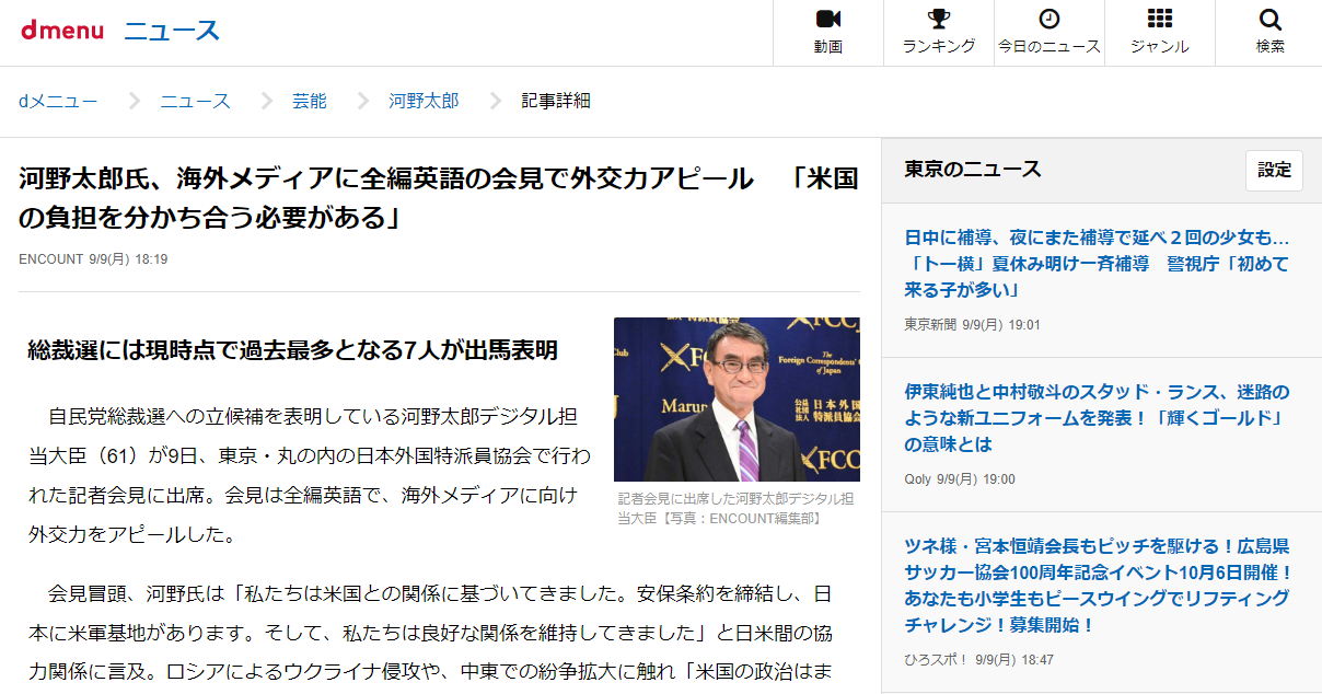 自民党総裁選への立候補を表明している河野太郎デジタル担当大臣(61)が9日、東京・丸の内の日本外国特派員協会で行われた記者会見に出席。会見は全編英語で、海外メディアに向け外交力をアピールした。