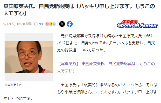 元宮崎県知事で衆院議員も務めた東国原英夫氏(66)が12日までに自身のYouTubeチャンネルを更新し、自民党の総裁選について語った。