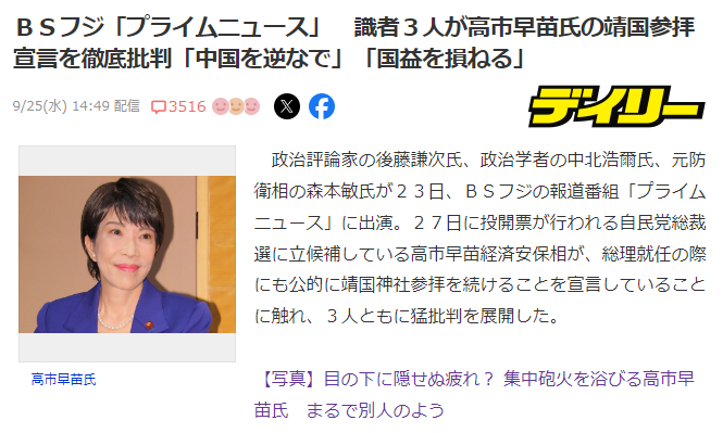 政治評論家の後藤謙次氏、政治学者の中北浩爾氏、元防衛相の森本敏氏が23日、BSフジの報道番組「プライムニュース」に出演。27日に投開票が行われる自民党総裁選に立候補している高市早苗経済安保相が、総理就任の際にも公的に靖国神社参拝を続けることを宣言していることに触れ、3人ともに猛批判を展開した。