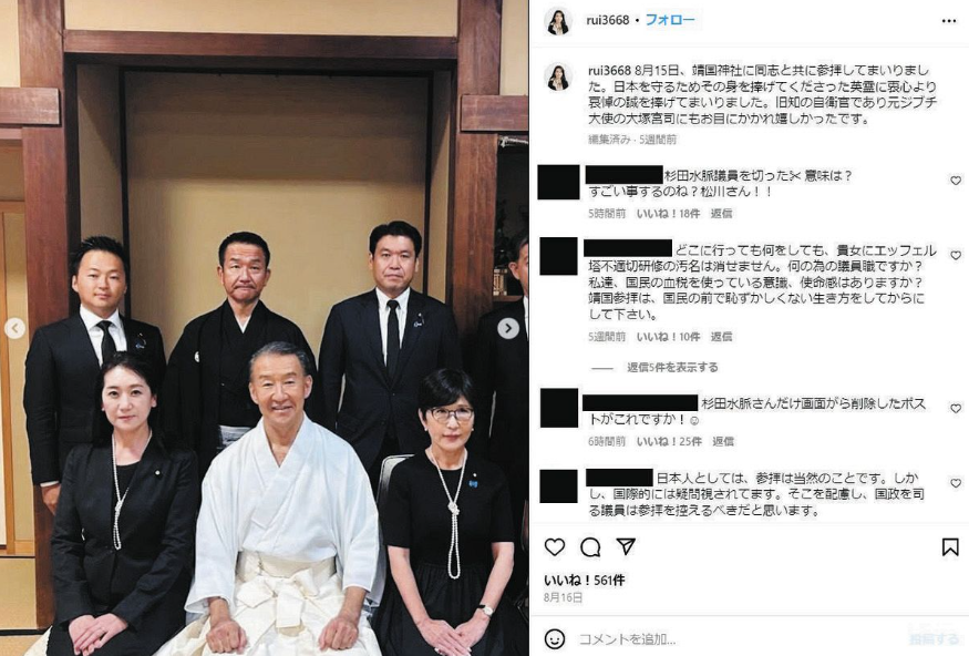 1: 名無し 2024/09/26(木) 00:24:03.73 ID:W90XerPT9エッフェル姉さん・松川るい議員、集合写真から特定の議員排除!? 靖国参拝で『不自然なトリミング』指摘の声「同じ自民党なのに…」:中日スポーツ・東京中日スポーツ