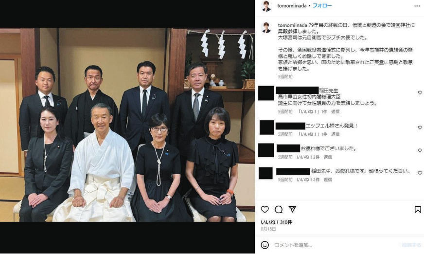一方、一緒に写っている同党の稲田朋美衆院議員も、自身のインスタグラムに同じような構図の写真を投稿。だが、この写真の右端には松川議員の投稿写真に入っていない同党の杉田水脈衆院議員、田畑裕明衆院議員の姿が確認できる。(略)
