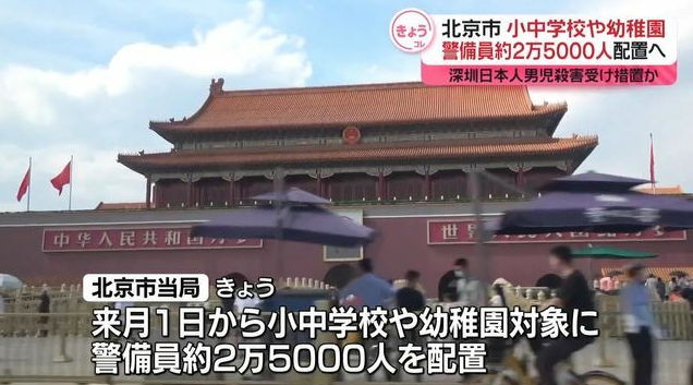 中国の北京市は、来月1日から市内の小中学校や幼稚園に警備員およそ2万5000人を配置すると発表しました。広東省の深センで日本人の男子児童が殺害された事件を受けての措置とみられます。