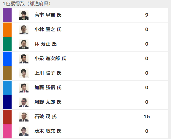 【速報】リアルタイムNHK・都道府県ごとの開票速報 1位獲得数「石破17、高市9、他0」