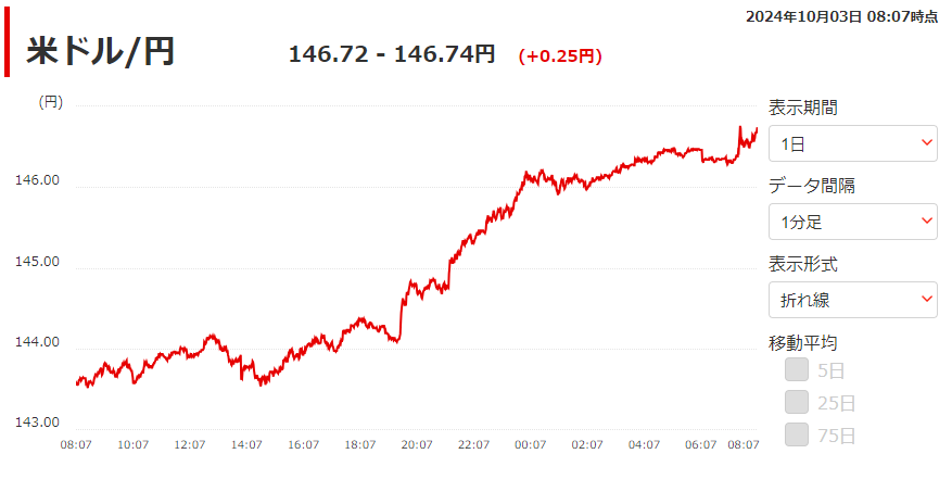 2日夕の東京市場の円相場は、1ドル=144円05~08銭で取引されていたが、1日たらずで2円以上円安が進行した。石破首相が2日、日本銀行の追加利上げについて「そのような環境にあるとは思っていない」と発言したことで、日銀の利上げ観測が後退した。