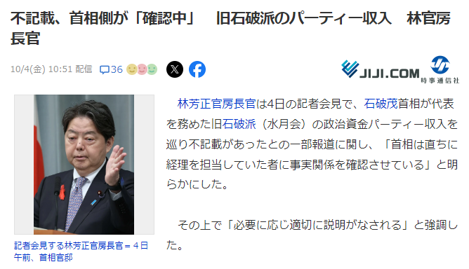 不記載、首相側が「確認中」 旧石破派のパーティー収入 林官房長官