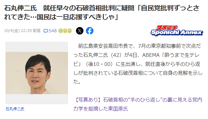 石丸伸二氏 就任早々の石破首相批判に疑問「自民党批判ずっとされてきた…国民は一旦応援すべきじゃ」前広島県安芸高田市長で、7月の東京都知事前で次点だった石丸伸二氏(42)が4日、ABEMA「酔うまで生テレビ」(後10・00)に生出演し、就任直後から手のひら返しが批判されている石破茂首相について自身の見解を示した。