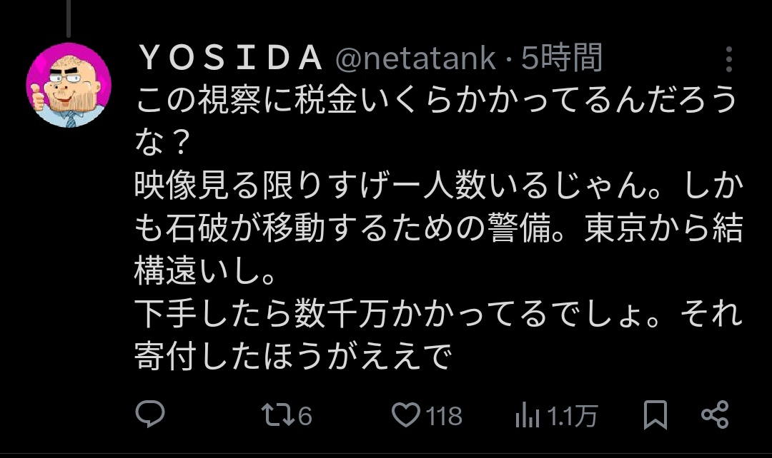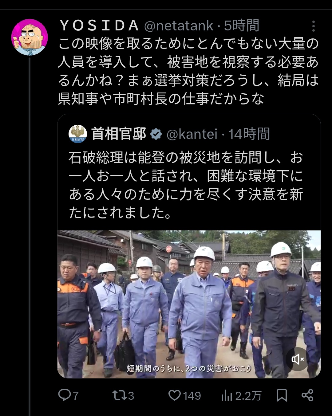 【画像】人気大手YouTuberが苦言「石破の能登視察無駄じゃね?その金を寄付してやれよ」