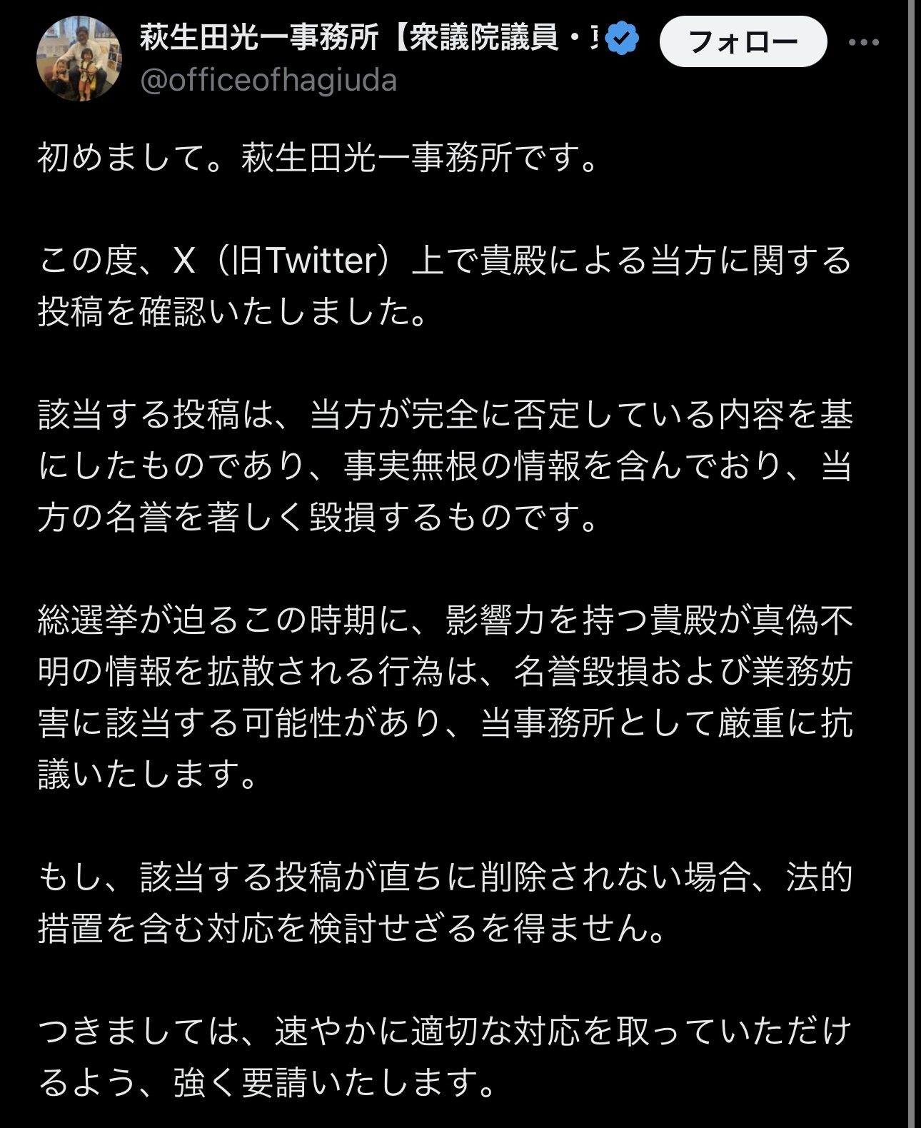 【悲報】萩生田光一さん、西村ひろゆきに対し名誉毀損及び業務妨害により法的措置を警告