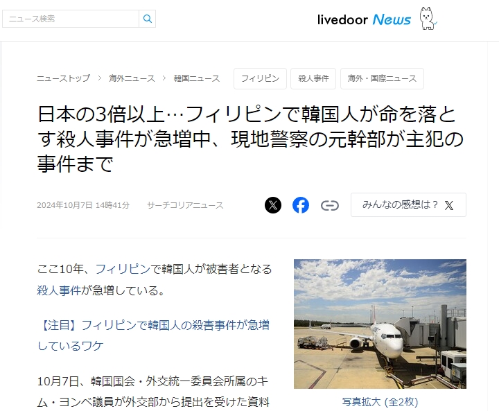 ここ10年、フィリピンで韓国人が被害者となる刹人事件が急増している。