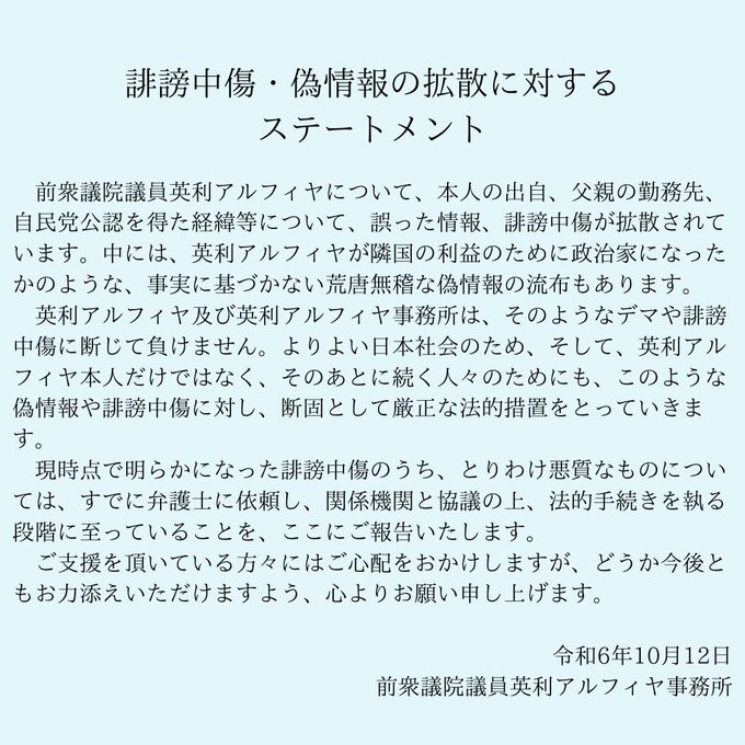 声明では「本人の出自、父親の勤務先、自民党公認を得た経緯等について、誤った情報、誹謗中傷が拡散されています。中には、英利アルフィヤが隣国の利益のために政治家になったかのような、事実に基づかない荒唐無稽な情報の流布もあります」と指摘。「そのようなデマや詳謗中傷に断じて負けません」とし、悪質なものについては法的措置の準備に入っていることも明らかにした。