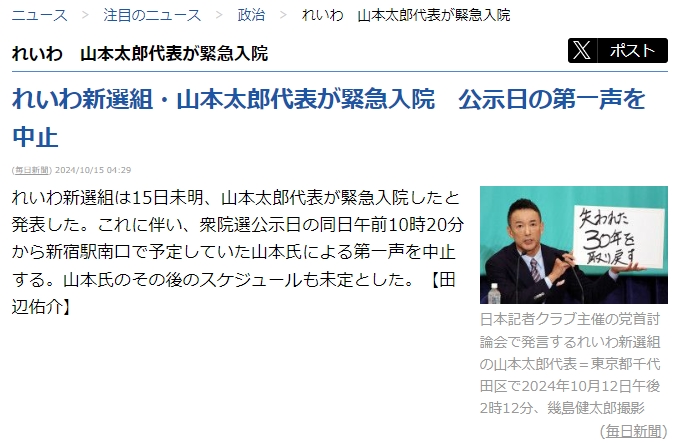 れいわ新選組は15日未明、山本太郎代表が緊急入院したと発表した。これに伴い、衆院選公示日の同日午前10時20分から新宿駅南口で予定していた山本氏による第一声を中止する。山本氏のその後のスケジュールも未定とした。【田辺佑介】