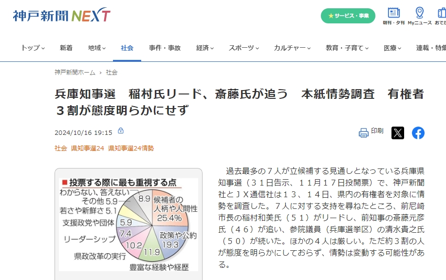 【朗報】兵庫県知事選挙の情勢調査、前知事の斎藤元彦さんが2位で猛追wwwwww