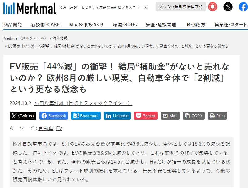 EV販売「44%減」の衝撃! 結局“補助金”がないと売れないのか? 欧州8月の厳しい現実、自動車全体で「2割減」という更なる懸念も