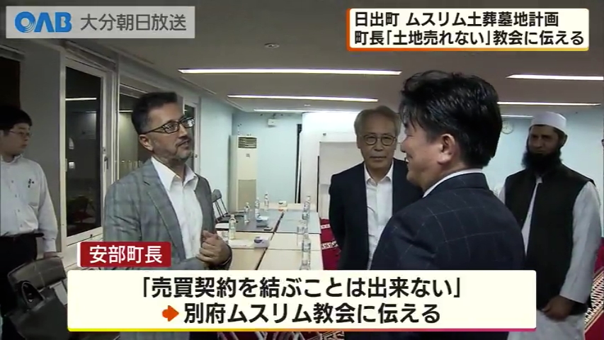 大分県別府市の宗教法人「別府ムスリム協会」が同県日出町の町有地に建設を計画するイスラム教徒の土葬墓地を巡り、同町の安部徹也町長は17日夜、同協会のカーン・タヒル代表(57)と面会し、町有地を売却しない考えを正式に伝えた。