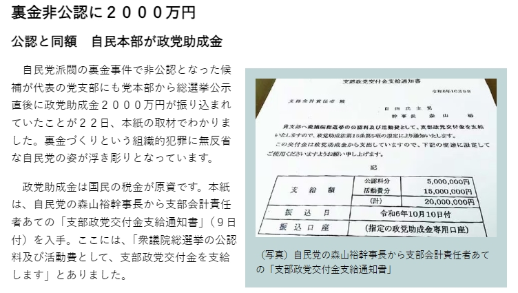 【しんぶん赤旗】自民本部、裏金非公認に政党助成金2000万円を公示直後に振り込み 公認と同額
