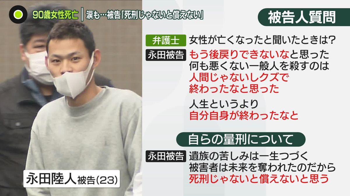 (略)一方で、弁護側から、現在は被害女性に対してどう思っているか問われると、永田被告は拘置所で犯罪被害者に関する本を読んだことや、拘置所職員との会話などで心境の変化があったとして、被害女性や遺族に対し、「本当にごめんなさいとしか言えないです」と涙ながらに謝罪。「謝罪して楽になる人がいるなら、謝罪し続けます」と述べました。