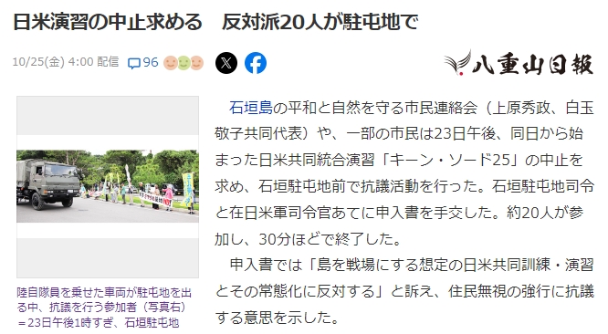 石垣島の平和と自然を守る市民連絡会(上原秀政、白玉敬子共同代表)や、一部の市民は23日午後、同日から始まった日米共同統合演習「キーン・ソード25」の中止を求め、石垣駐屯地前で抗議活動を行った。石垣駐屯地司令と在日米軍司令官あてに申入書を手交した。約20人が参加し、30分ほどで終了した。
