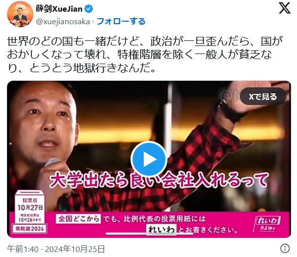 中国在大阪総領事、れいわ新選組の選挙宣伝動画を拡散wwwww