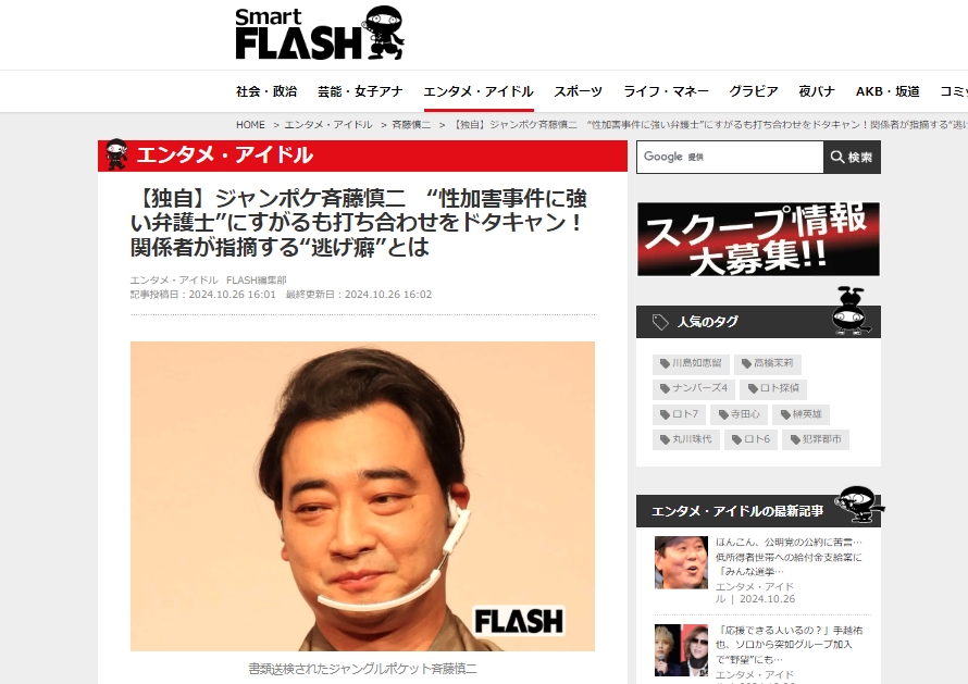 【悲報】ジャンポケ斉藤、性加害事件に強い弁護士を確保するも逃げ癖出てしまい打ち合わせドタキャンしたと報じられる