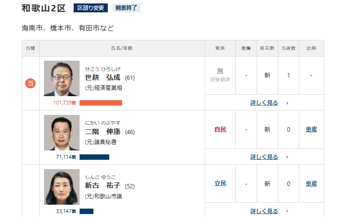 【選挙反省会】和歌山2区・二階俊博の三男・伸康氏(46)が71,114票で落選 世耕弘成(61)が101,739票で当選 二階は比例近畿ブロックで復活できず