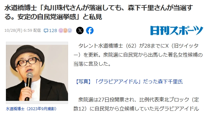 【新着】水道橋博士「丸川珠代さんが落選しても、森下千里さんが当選する。安定の自民党選挙感」と私見