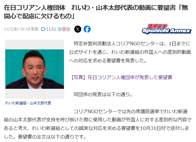 1: 名無し 2024/11/01(金) 11:47:57.11 ID:qEOcR/pa0● BE:662593167-2BP(2000)特定非営利活動法人コリアNGOセンターは、1日までに公式サイトを通じ、れいわ新選組の外国人への差別的動画への対応を求める要望書を発表した。同団体の発表は以下の通り。