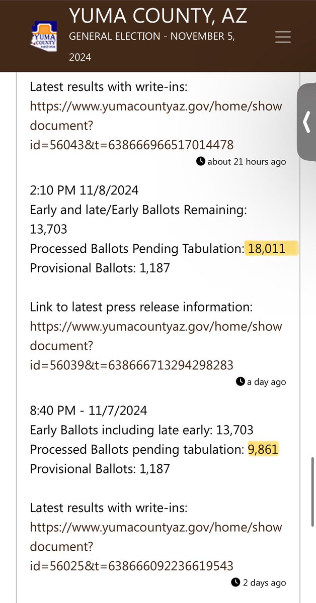 ユマは、残り 9,861 票から 18,011 票にどうやって移行したのか? そして、選挙後の土曜日の夜になってもまだ「結果」が出ていないのはなぜなのか? なぜなら彼らはKariLakeからそれを盗んでいるだ!